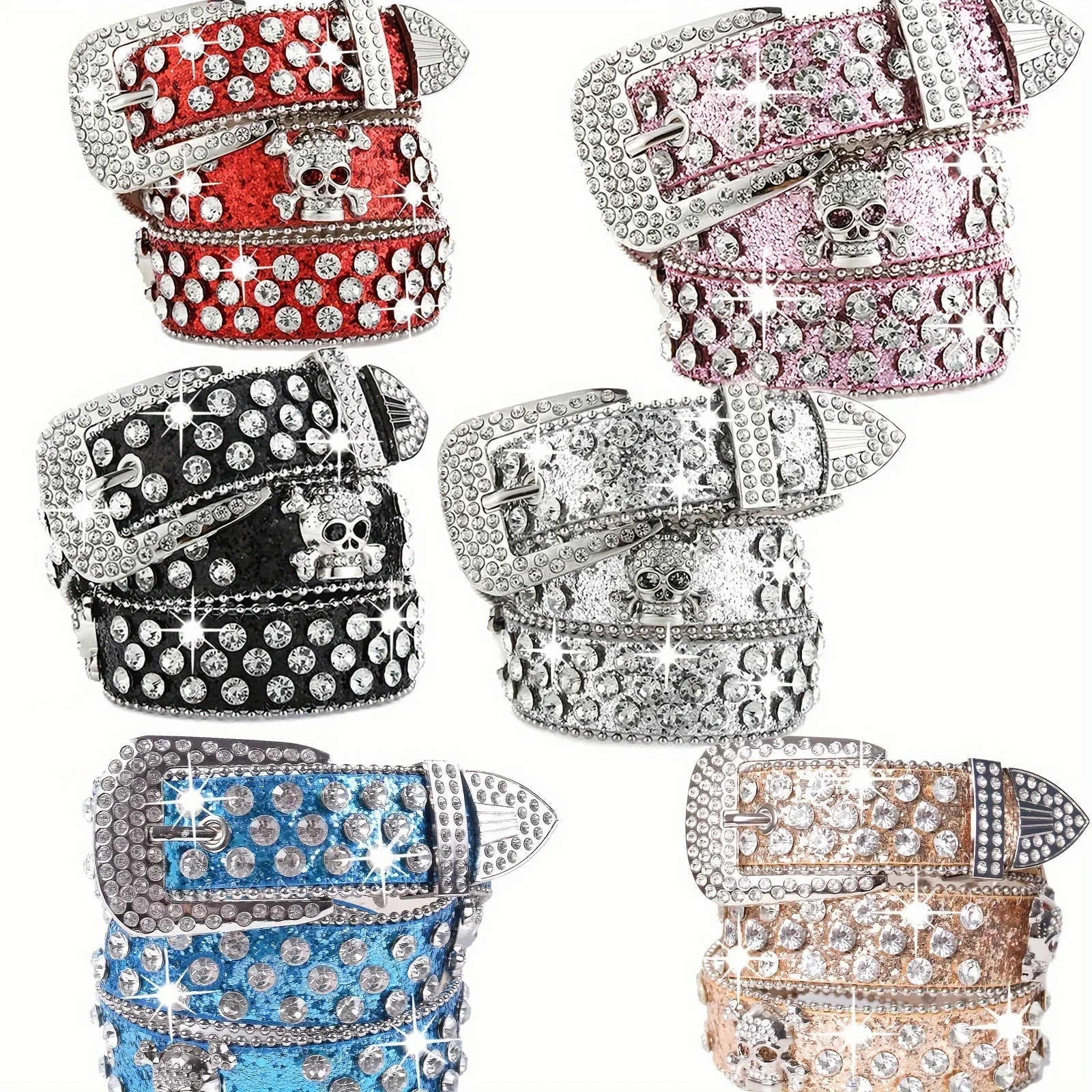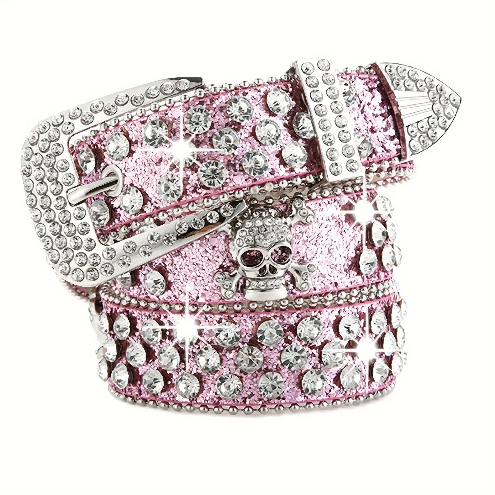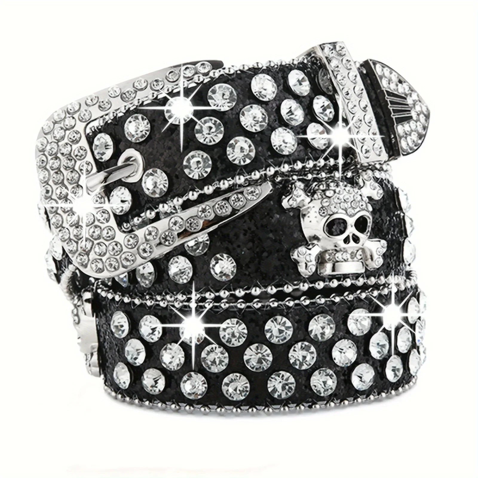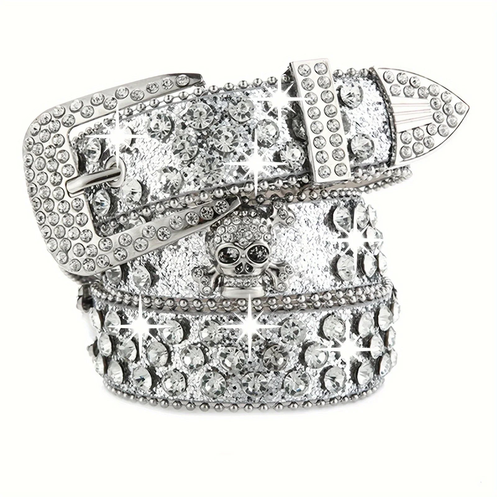 Affirmez votre style avec cette ceinture ornée de strass scintillants et d’un motif tête de mort argentée. Ultra brillante, audacieuse et pleine de caractère, elle est l’accessoire parfait pour un look glam rock, western chic ou festival.